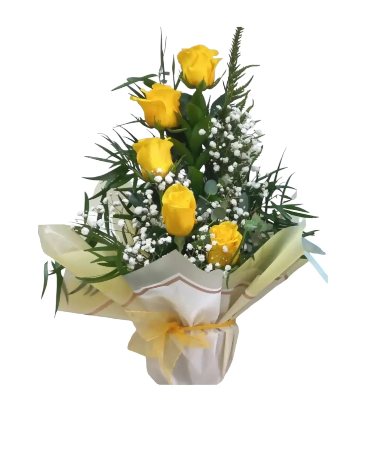 Rosas amarillas, gipsófilas, flores verde de temporada, base.