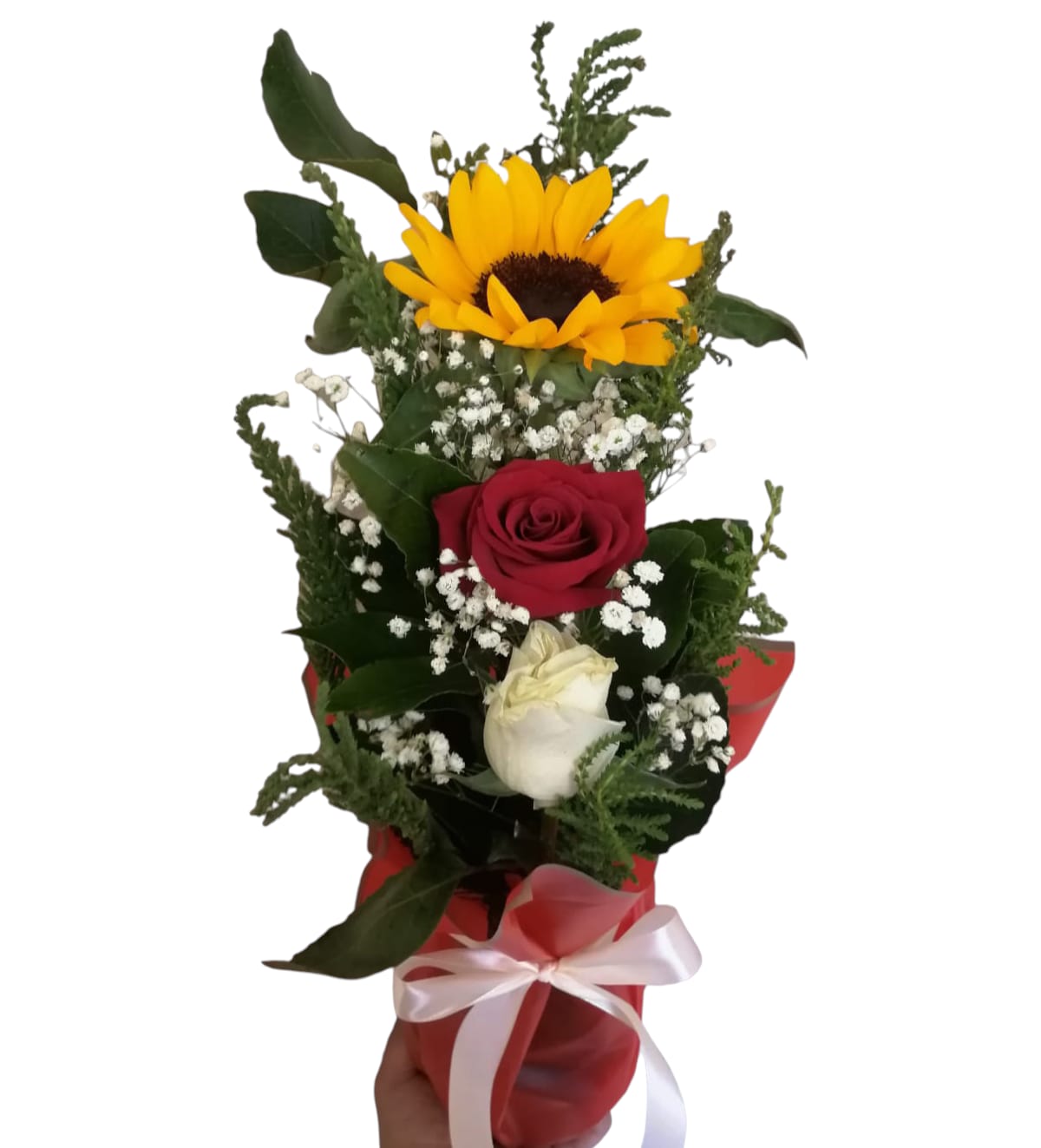 1 girasol, 1 rosa roja, 1 rosa blanca, 2 gypso, 1 papel, 1 cintal, 1 oasis, flores verde de temporada