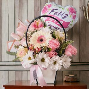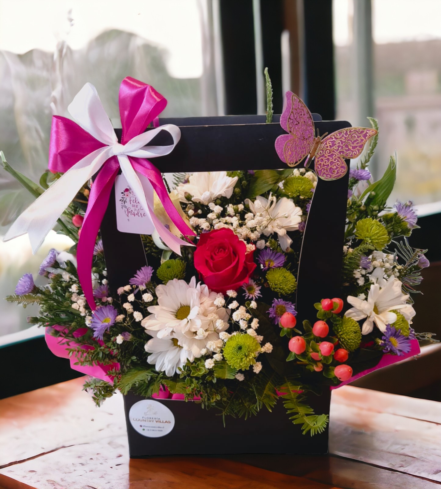 Rosa fuscia, hipericun rosado, margaritas blancas,maule verde, aster violeta, gipso, flores verdes de temporada