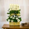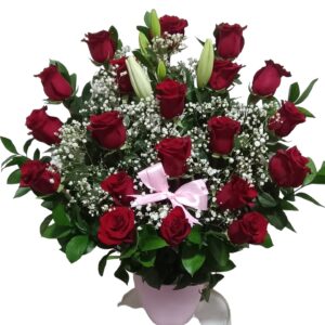12 Rosas rojas, 7 Girasoles, 10 Ruscus, base, oasis