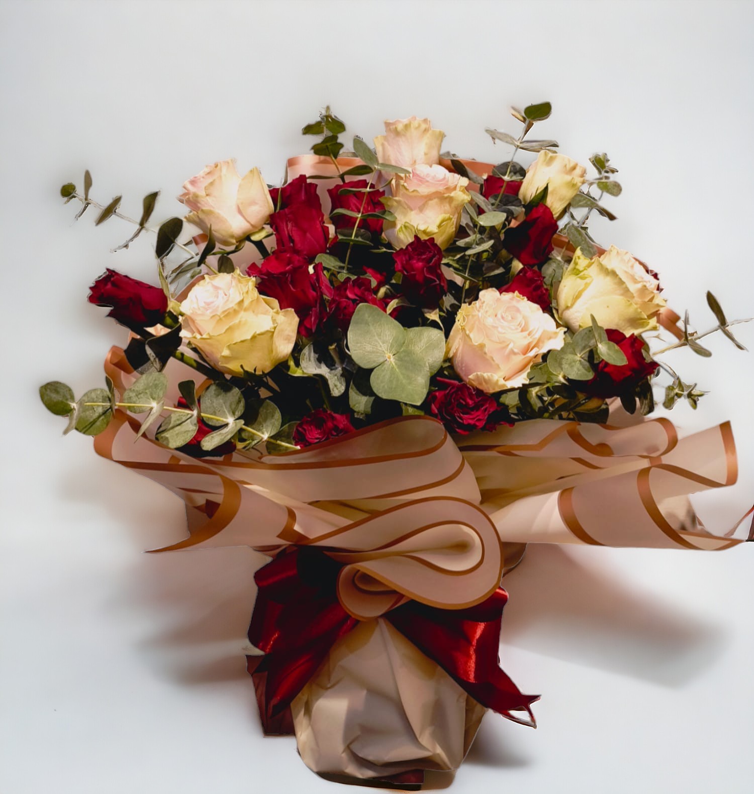 7 Rosas rosadas, 7 Mini Rosas ecuatoriana Rojas, papel beige, eucalipto