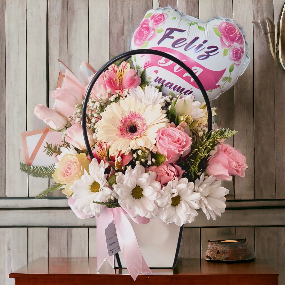 Flores rosadas de temporada, Flores verdes de temporada, Globo de feliz dia mama.